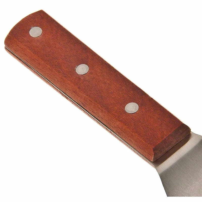The extra long grilling spatula features wooden handle with rivet design. It’s stainless steel construction makes it perfect for a professional chef, restaurant use, or any kitchen cook. The large flexible heavy-duty surface measures 14″ overall with extra length for grabbing or flipping multiple items at once. It’s great for pancakes, eggs, hamburgers, potatoes, carne asada or anything on the grill.