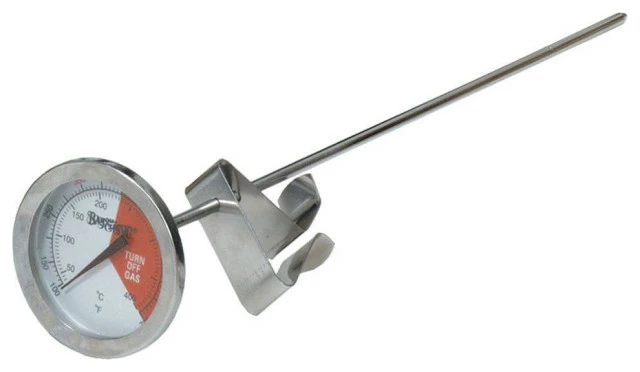 Check the temperature of your oil in your turkey fryer with our stainless steel turkey fryer thermometer. If you are looking for a replacement thermometer for your turkey fryer, you have come to the right place. We get thousands of phone calls every year from people who have lost their turkey fryer thermometer or someoneβs walked off with it. Is this you? The Bayou Classic turkey fryer thermometer is stainless steel and dishwasher safe. This turkey fryer thermometer reads the temperature from 100 degrees to 750 degrees. There is a red fire hazard zone starting at the 450 degree point. The stem of the thermometer measures 12″ long.