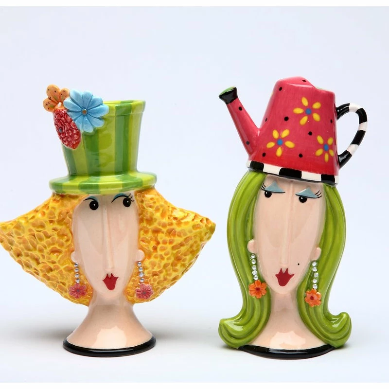 The Garden Lady Salt and Pepper Shakers make a fun, eye-catching addition to a kitchen island or table. This hand-painted ceramic set includes two women wearing colorful top hats shaped like buckets and watering cans. Hand wash only.