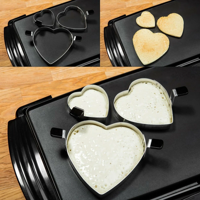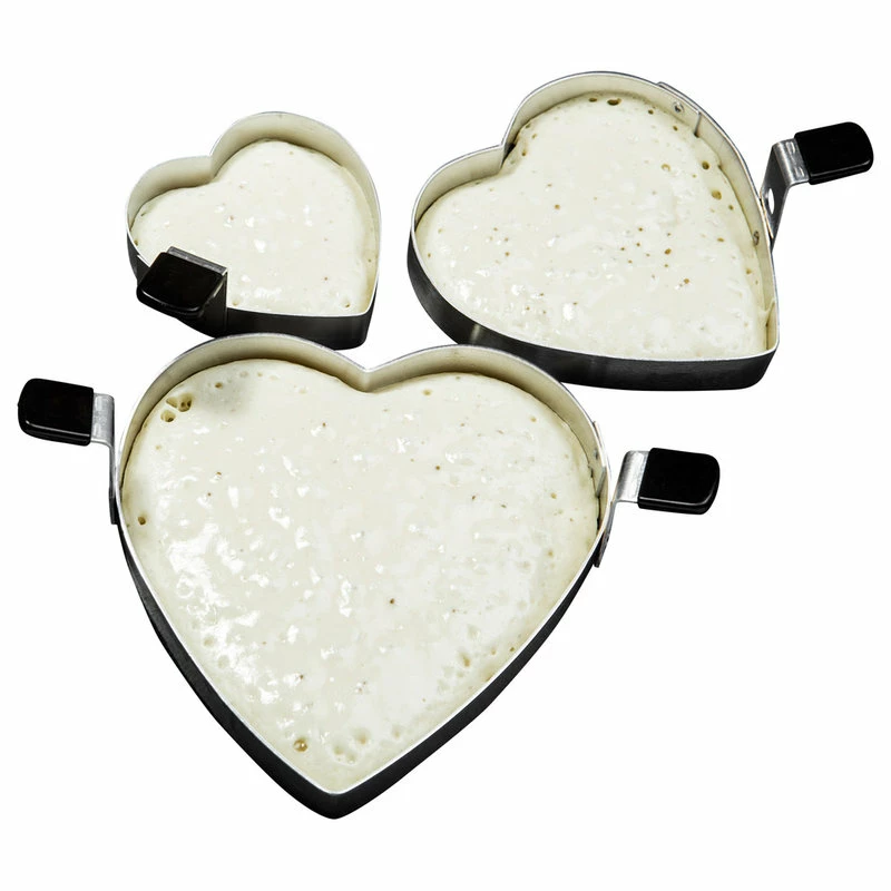 Hearts Shape-Its Food Forms are manufactured from an aircraft aluminum alloy that has been specially processed to provide years of durable use without losing its shape. These forms work great for shaping any kind of shapeable food (i.e. pancakes, cakes, cookies, gelatin, ice cream, marshmallow treats, brownies and more.) Each form is easy to clean, dishwasher safe, oven safe to 350 degrees and will not rust. All Shape-Its Forms are equipped with folding handles to make storing easy.