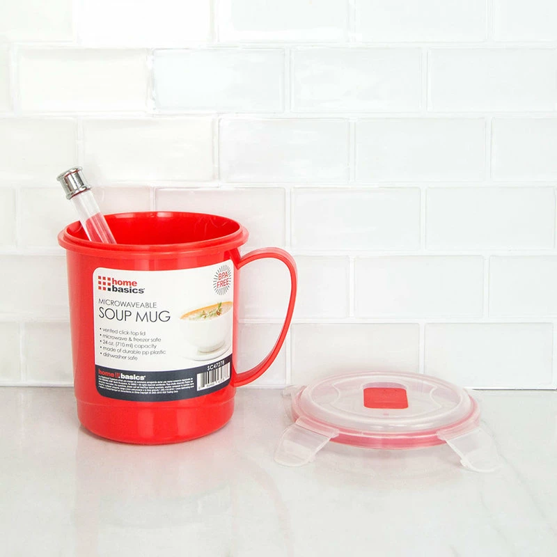 24 oz. Plastic Microwaveable Soup Mug, Red/ClearWhen the temperatures drop and makes its way to town, treat yourself to hot meal to keep you warm and cozy Fit an entire can of soup in this 24 oz. microwaveable mug. With a tight-fitted click top lid, never worry about opt spilling on your way to your busy commute. Click the lid in to place, toss it in the fridge to save for later. Reheat your meals right inside the cup, stow it away in the dishwasher to clean and you’re ready to warm your spirits with a delicious meal once again.Made of durable pp plastic24 oz. capacityIdeal for reheating water-based food, steaming or short term boilingVented click-top lid keeps microwaves safe from messy spill-overs