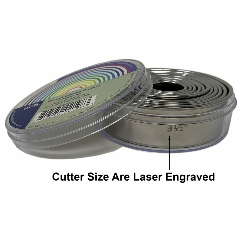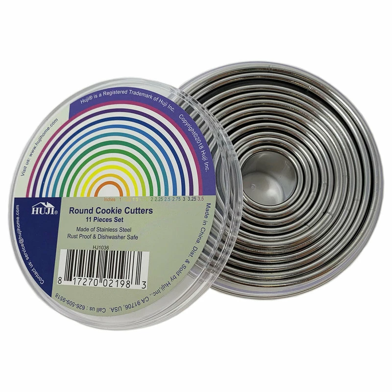 - Package contains 11 round cutters with a plain edge.