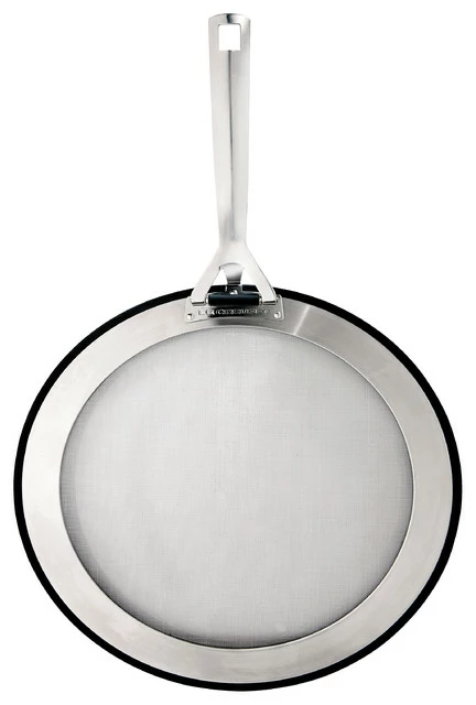 Specifically designed to fit on all Le Creuset Fry Pans and Skillets between 9 ” and 11 “, the Stainless Steel Splatter Guard rests securely over the rim of the pan to protect surrounding surfaces from hot oil, while its silicone rim will not scratch cooktops or countertops.