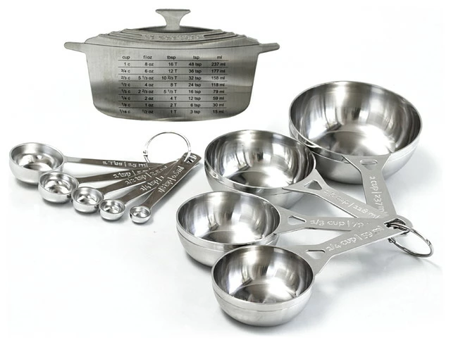 Accurately measure ingredients for cooking and baking with this Le Creuset measuring cup and spoon set. Included in the set are measuring cups measuring spoons and a converter magnet. Made of stainless steel the cup set includes 1/4 1/3 1/2 and 1 cup sizes and the spoon set includes 1/8 teaspoon 1/4 teaspoon 1/2 teaspoon one teaspoon and 1 tablespoon sizes. The cups feature a modern design with flat bottoms to rest securely on surfaces and the spoons are small enough to fit inside many jars for extracting seasonings. Both the cups and the spoons nest into the largest of each set to save space when storing in drawers. The measure magnet made of stainless steel conveniently displays various cooking measurement conversions. Because it’s a magnet it stays close at hand on any metal surface in your kitchen. Perfect for baking and cooking this set is dishwasher safe making clean up a breeze.