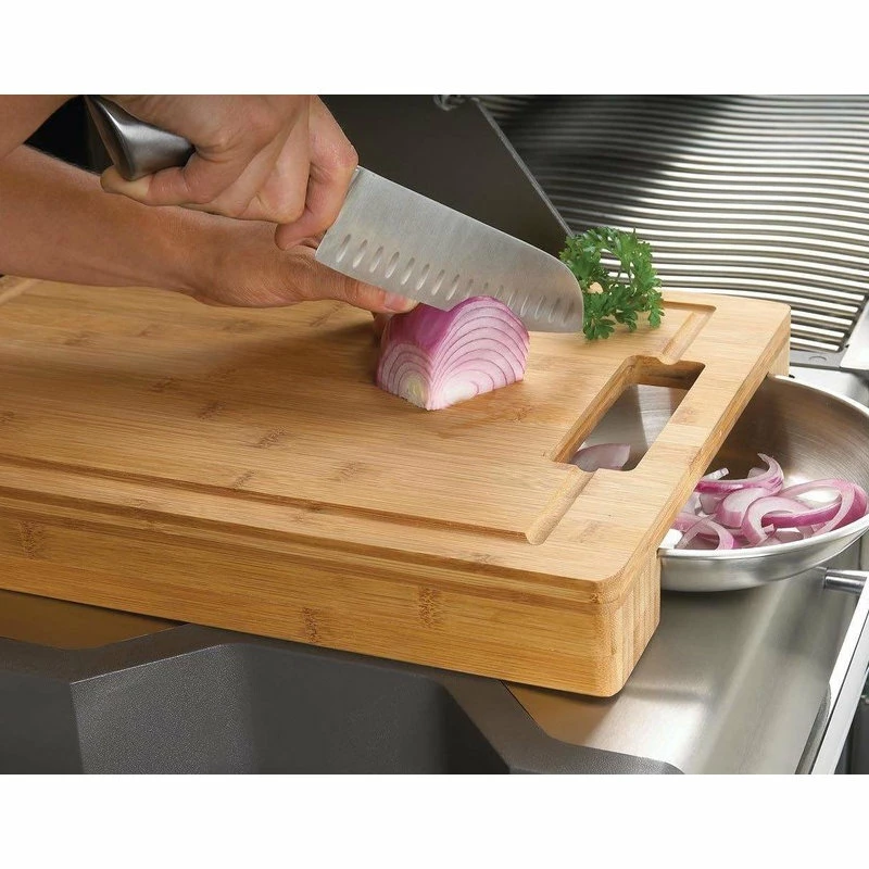 The Pro Carving/Cutting Board with Stainless Steel Bowls offers a high quality cutting board kit to complete the ultimate BBQ prep space. The high quality bamboo cutting board features an inlay to catch overflowing juices from steaks and other juicy foods hot off the grill while the innovative cutouts in the side feature space for the two included stainless steel bowls to catch the food you’re cutting.