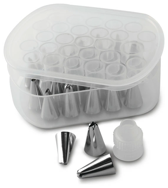 Decorate cakes, cookies, and cupcakes like a professional using this 27 piece decorating tip set from Nordic Ware. This kit includes 26 of the same tips used by expert bakers, each of which has a different design so you can create your own masterpieces at home. Made in the USA, this set also includes a standard coupler and a handy storage case to carry everything. Versatile and built to last, this decorating tip set is a great gift for any aspiring baker.