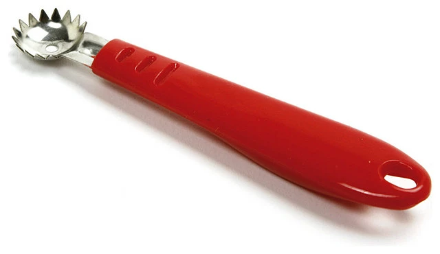 Easily core tomatoes and more with this Norpro Core It. This handy tool has stainless steel teeth and a tomato-red plastic body. To use with tomatoes, insert the teeth of the corer at the stem and twist out. For strawberries, hook the stem off with teeth of the corer. This Core It is ideal for a variety of fruits and vegetables.