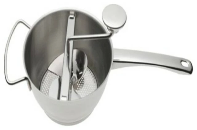 Ideal for fruits, vegetables sauces, purees, and baby food. Made of 18/10 gauge stainless steel. Use as strainer (sieve) separates skins and seeds from purees. Mash or rice potatoes. Comes apart for easy cleaning.