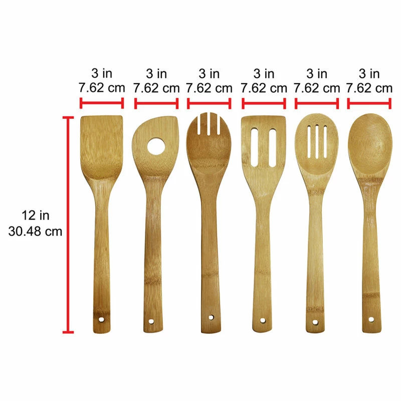 Whether you are replacing a new set of bamboo utensil or adding more to your cooking gadgets, this 6-Piece Bamboo Cooking Utensil Set from Oceanstar will do the job. This set includes a Turner Spatula, a Rounded Fork, a Single Hole Mixing Spoon, a Slotted Spatula, a Slotted Spoon, and a Bamboo Spoon. It is made out of strong bamboo, a fast-growing material that reduces environmental impact. This is a perfect accessory for any kitchen lover. Whether you are a professional cook or beginner cook, this 6-Piece Bamboo Cooking Utensil Set will be a great prep tool. Present this cooking set to someone special or anyone who loves to cook as a wonderful housewarming or holiday gift. Easy to maintain; simply wash with mild soap and water, and dry thoroughly. The length of each spoon measures approximately 11.75 inches.