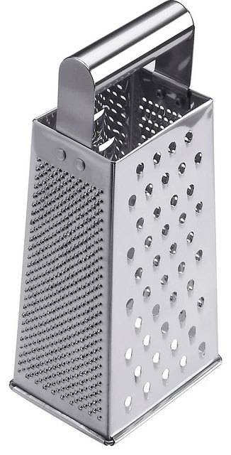 Create a chef inspired meal with this deluxe grater from Progressive International. Featuring a stainless steel construction for long lasting durability, it has four grating sides to grate and shred from coarse to fine. With a convenient handle for stability and easy transport, it has large holes for potatoes, medium holes for cheeses, and small holes for hard cheeses and chocolate. Best of all, it is also dishwasher safe, making clean up a breeze.