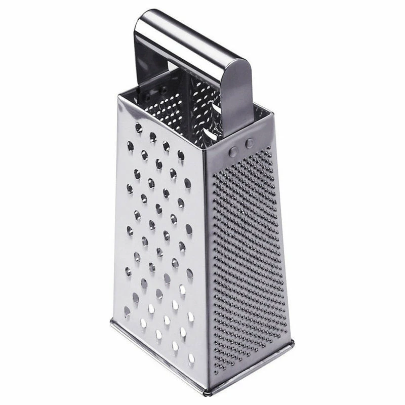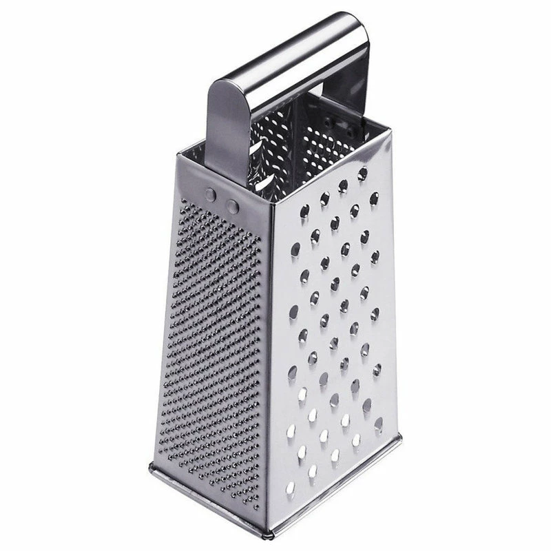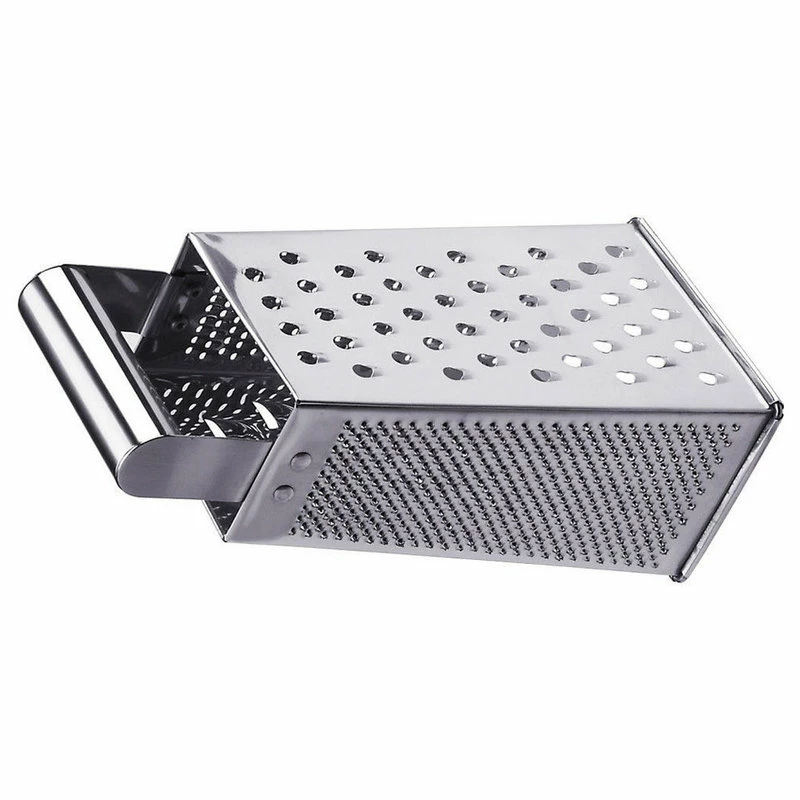 Progressive International is your source for the widest range of functional, inventive, and fun kitchen tools and great ideas put into practice. Our in-house designers spend hours in the kitchen coming up with ways to improve on a variety of traditional tasks and tools. Established in 1973, our commitment to quality and service allows us to offer a broad selection of quality kitchenware and other household products. The Progressive deluxe box grater features a comfortable and sturdy grip handle. The large hole grating surface on one side is for potatoes, the medium holes are for cheeses, and the small holes are for hard cheeses and chocolates. Handle and grater box are made with stainless steel.
