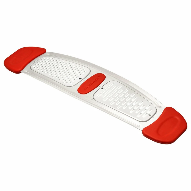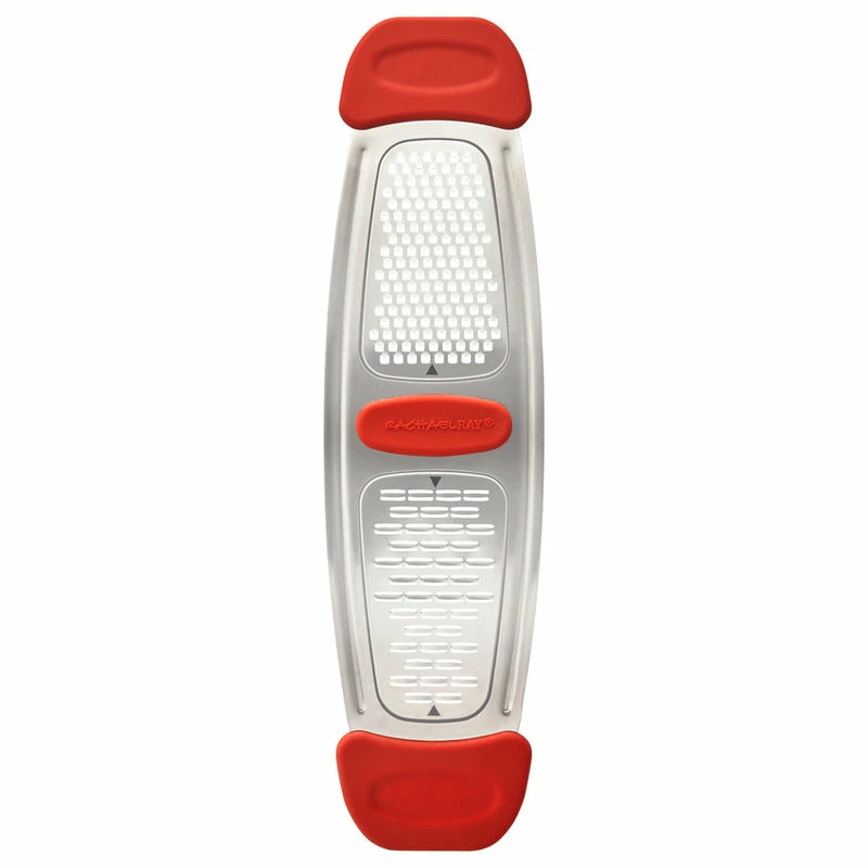 Rachael Ray always makes prepping fun and functional. Fine- and coarse-sized holes on both sides give cooks and eaters of all ages and tastes lots of grating choices. And the colorful silicone grips at the sides and in the center provide a handhold for righties and lefties alike. Set the grater over a bowl and use the sides during cooking, or hold it in the hand and grate right at the table. Use it for lemon zesting, hard-cooked eggs, fresh garlic, and more. The grater is top-rack dishwasher safe, and coordinates with other kitchenware and serveware from Rachael Ray.