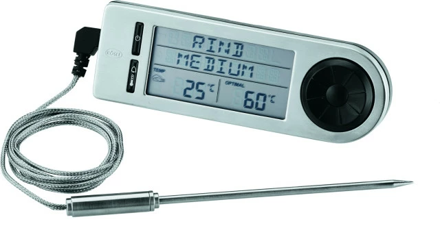 Roasting Thermometer digitalFor determining the ideal core temperature for five different types of meat. A second sensor measures the grill or oven temperature. Measuring range -20 degreeC to +250 degreeC/-4 degreeF to +482 degreeF. Display language selectable from German, English or French. Cable length of probe: 1 m/39.4 in.