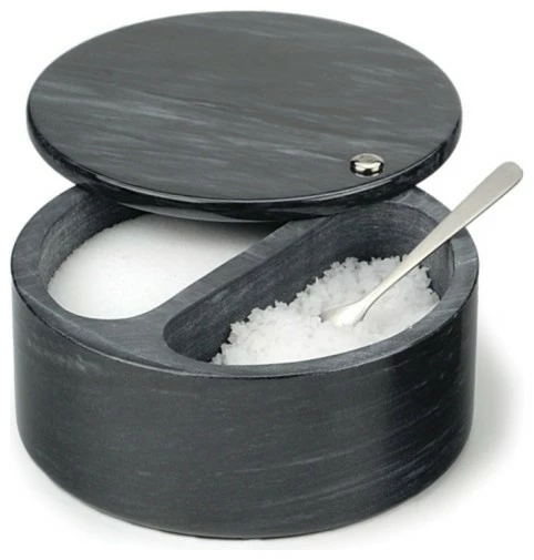 Marble salt box with a smooth swivel top and dual 5 ounce compartments. Fill with gourmet salts and sugars for a beautiful tabletop presence or convenient use in the kitchen.