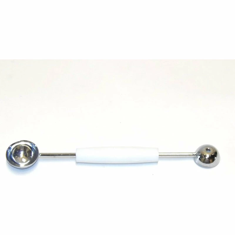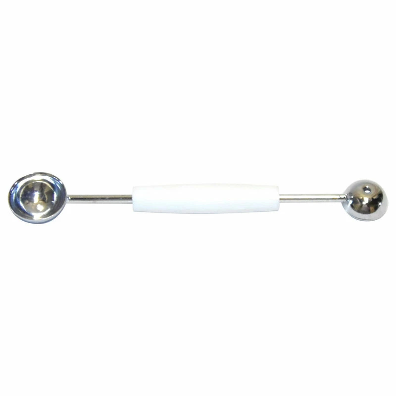 Classic 2 sided Fruit Melon Butter Baller. 2 sizes of baller: 1-1-1/8โ large side and 1-15/16โ small side. This is chrome plated and has a plastic handle for cleanliness. It is great for any Chef or Cook who want to be creative and dress up a table. Also great for infusing fruit in beverages or balling butter.