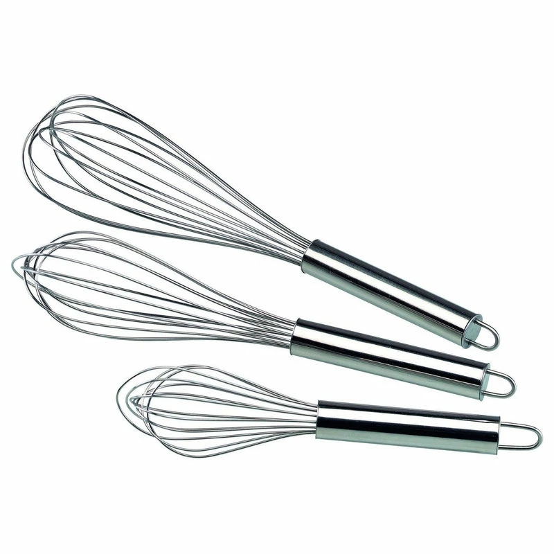 You could try to make one whisk fit all… or you could maximize your mixing range with this threesome of stainless-steel whisks. Try the largest whisk for big bowls of pancake batter, the midsize one for beating eggs, and the littlest for blending a small batch of vinaigrette. They are flexible but sturdy stainless-steel with professional-gauge handles, each sized accordingly. 8 inch 10 inch and 12 inch. Hang able for storage