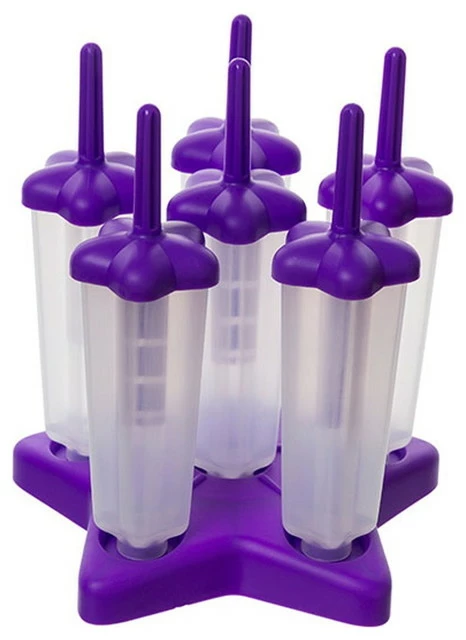 Delight your kids and their friends with homemade popsicles using these Tovolo ice pop molds. These unique bright purple, star shaped Tovolo drip guards add a fun pop of color to any summer day. Simply fill the mold with your favorite juice, yogurt or smoothie mixture and place the drip guard on top. The six molds rest on the included tray, making them easy to freeze and serve. Terrific for birthdays, parties, summer fun, and more.